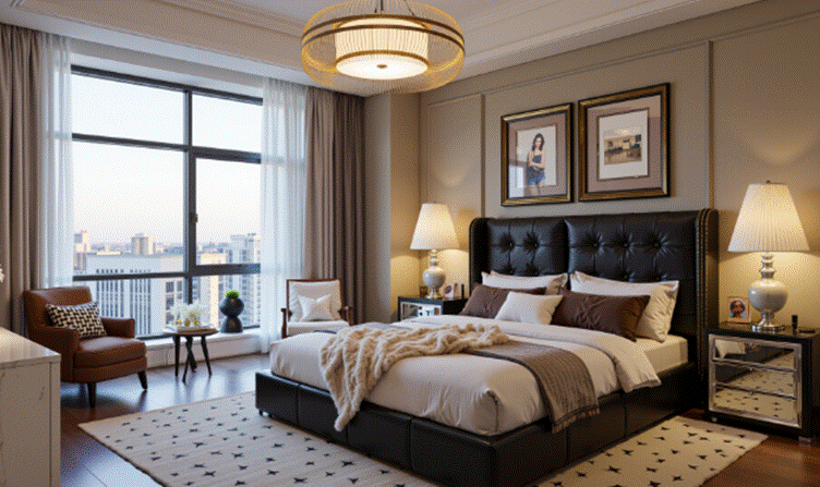 The bedroom creates a luxurious atmosphere with leather bedding and exquisite lighting, complemented by neutral-toned carpets. Every design element skillfully balances the textural tension between sophistication and relaxation.