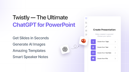 Do you want an AI presentation maker tool that works with PowerPoint, and you don’t have to visit other sites and applications? Unlike other standalone AI presentation tools, Twistly is designed to enhance the existing features of PowerPoint with AI automation.
