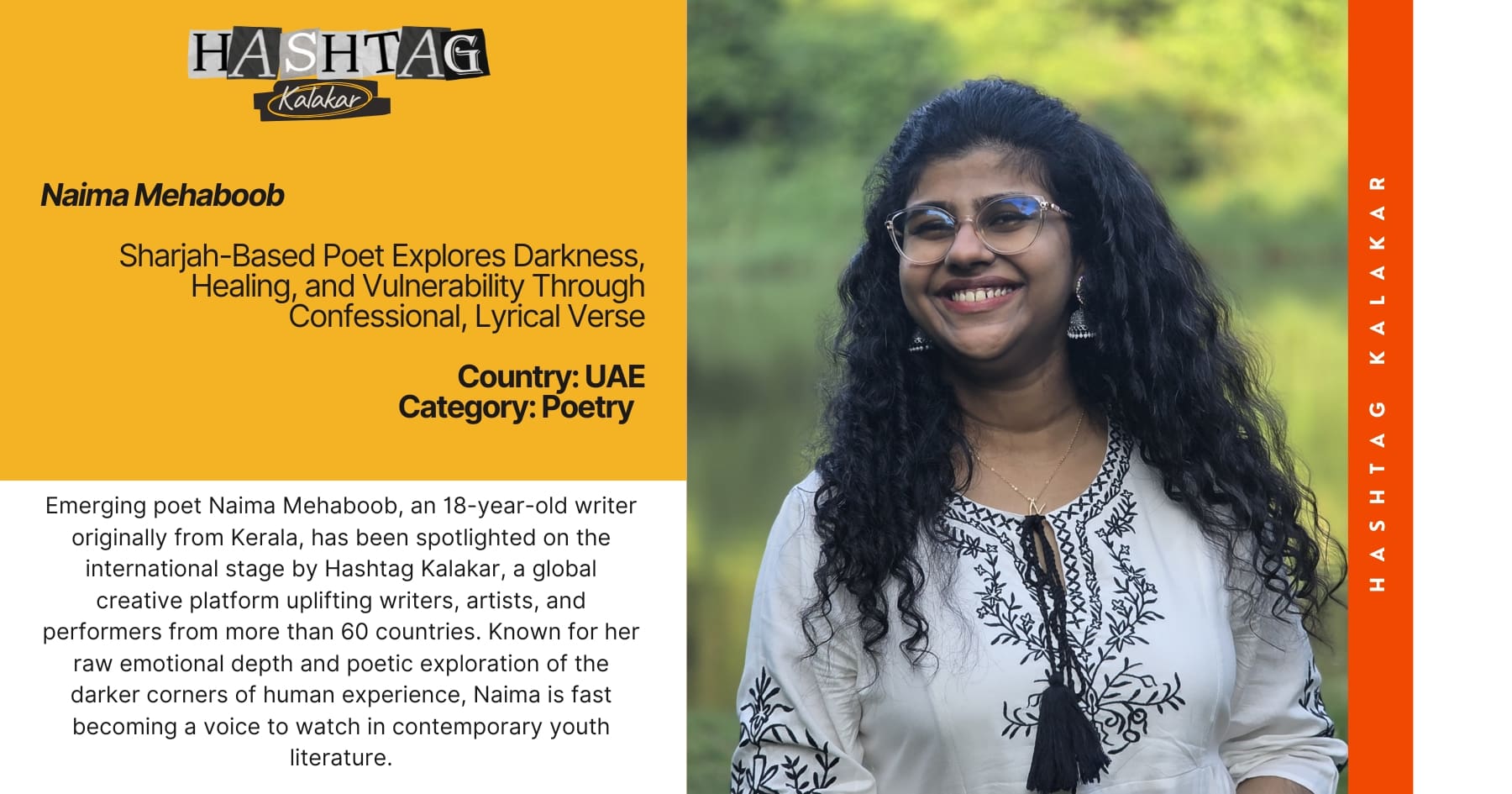Sharjah, UAE — Emerging poet Naima Mehaboob, an 18-year-old writer originally from Kerala, has been spotlighted on the international stage by Hashtag Kalakar, a global creative platform uplifting writers, artists, and performers from more than 60 countries. Known for her raw emotional depth and poetic exploration of the darker corners of human experience, Naima is fast becoming a voice to watch in contemporary youth literature.