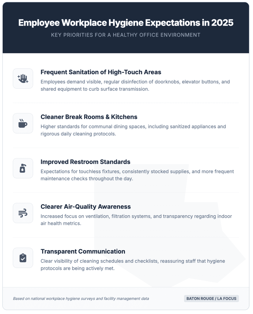 Baton Rouge facility managers report similar patterns, noting increased staff questions about restroom sanitation, common-area upkeep, and the frequency of cleaning cycles. These expectations extend beyond traditional office environments, influencing educational, healthcare, and industrial settings as well.