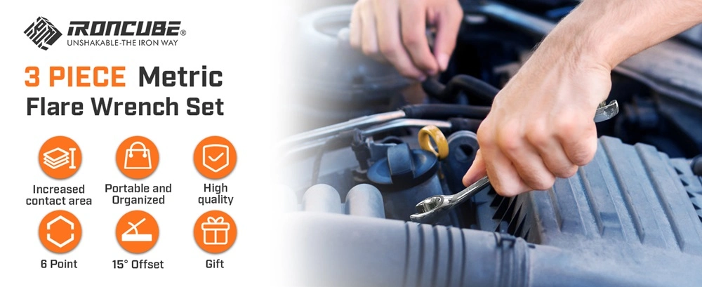 If your primary use case is brake line work, hydraulic fittings, or fuel line connections, you may want a dedicated flare nut or brake line wrench set instead of a standard open end. IRONCUBE offers a 3-piece metric brake line wrench set with sizes specifically selected for common brake line fittings. Flare nut wrenches wrap more of the nut’s circumference than a standard open end, reducing the risk of rounding off soft brass or copper fittings. For SAE applications, there’s also a matching 3-piece SAE brake line wrench set if you work on older American vehicles.