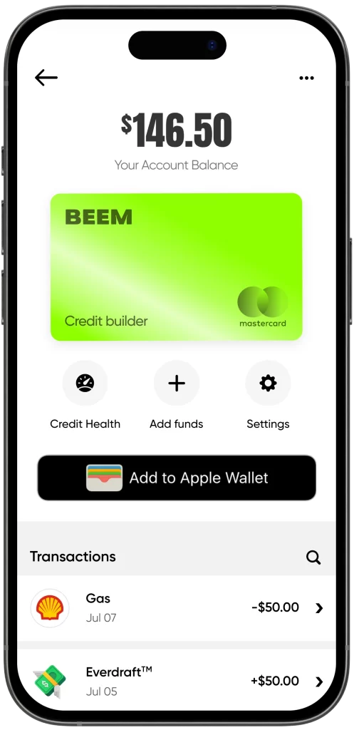 - Get your Beem Card, which activates your credit-building feature.