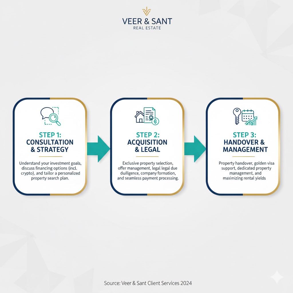 At Veer & Sant Real Estate, we go beyond merely facilitating a transaction. We are your dedicated partners, offering deep market insights, comprehensive support in financing property in UAE, innovative solutions like Veer & Sant crypto property payment, and end-to-end Dubai property management. We streamline complexities, maximize your returns, and ensure your investment journey is smooth and successful.
