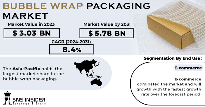 “According to the SNS Insider report, the bubble wrap packaging market Growth valued at $3.03 billion in 2023, is projected to reach an impressive $5.78 billion by 2031, exhibiting a robust compound annual growth rate (CAGR) of 8.4% during the forecast period of 2024-2031.
