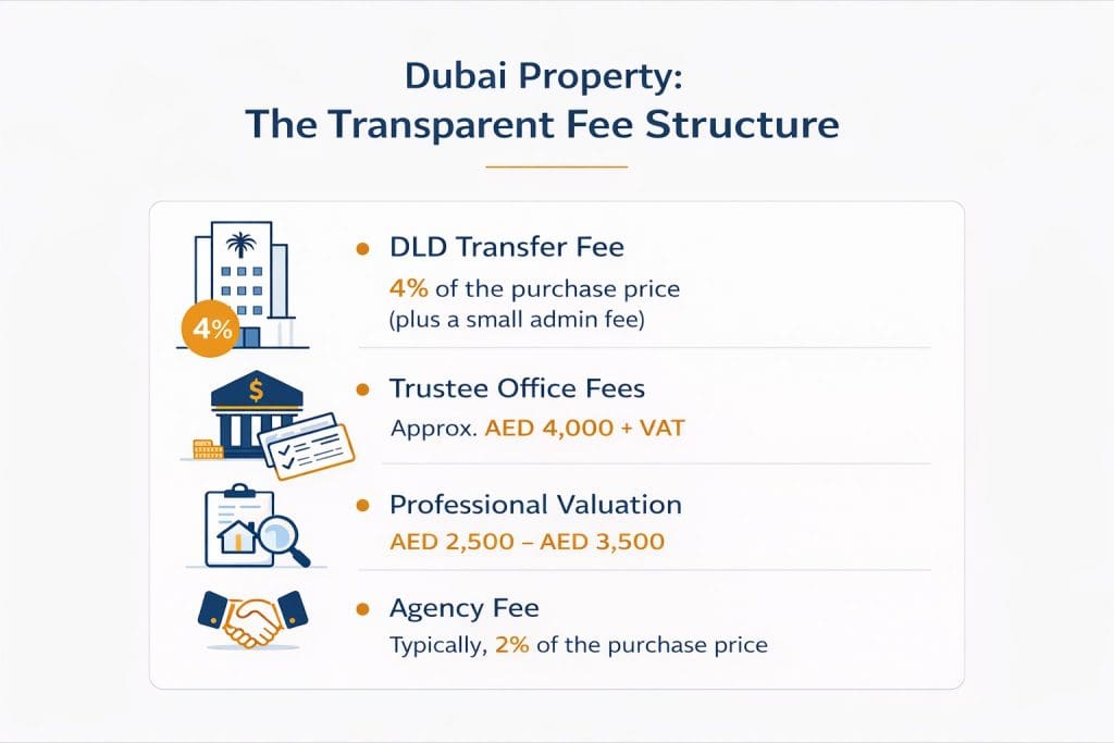 You should budget approximately 7% of the total property purchase price for various fees. This includes the mandatory 4% DLD fee, the 2% broker commission, and smaller administrative costs for the trustee office and title deed issuance.