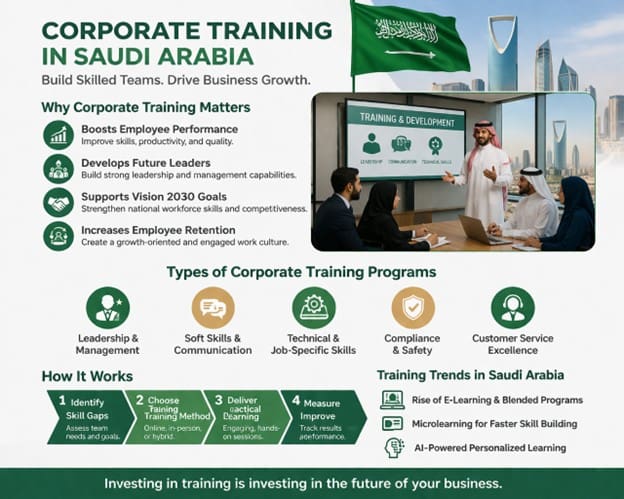 Corporate training in Saudi Arabia is a structured process where businesses improve employee skills through workshops, digital learning, and practical sessions. These programs focus on leadership, communication, and job-specific abilities to help companies increase productivity, improve performance, and stay competitive in a growing economy.