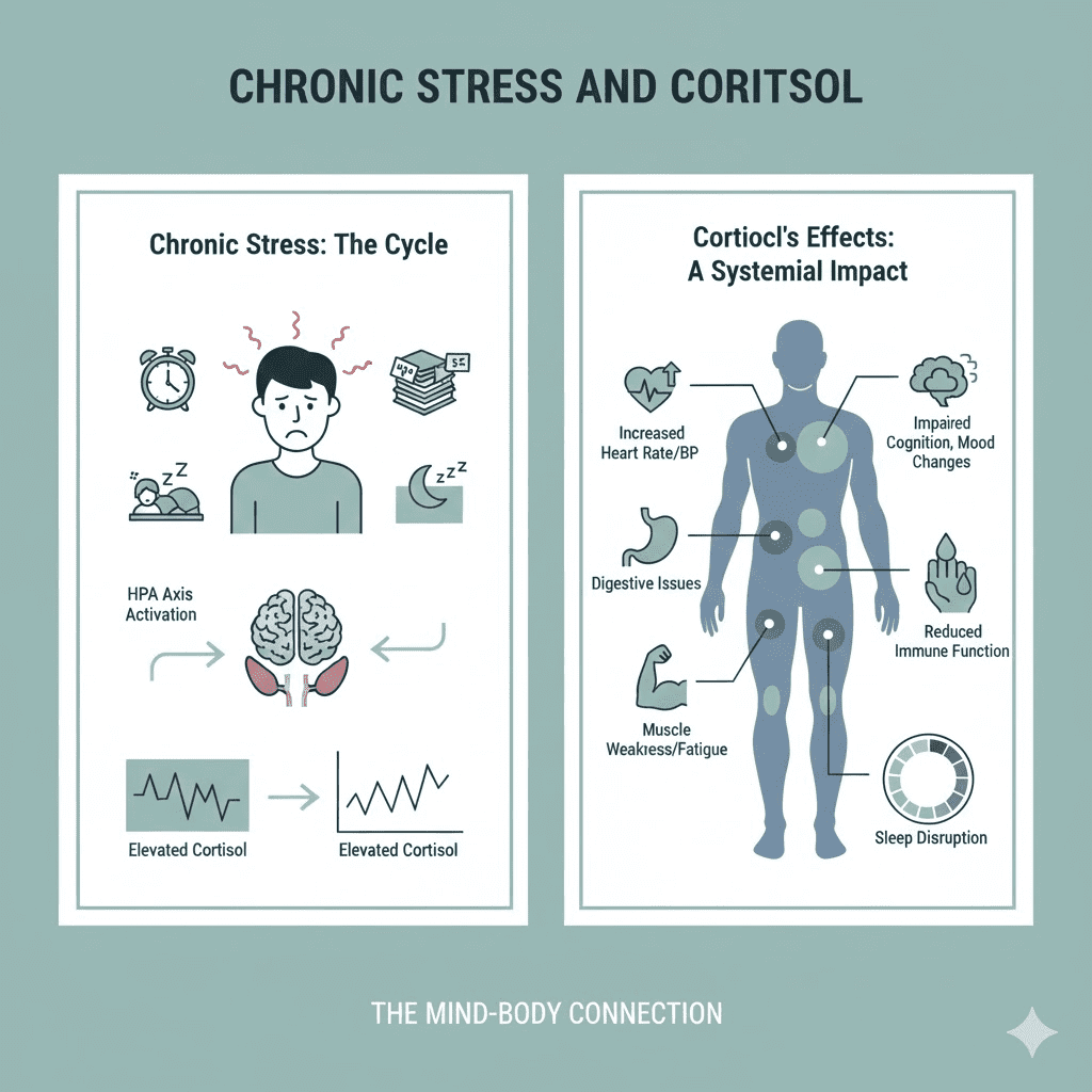 When people talk about stress, they often reduce it to mood. Physiologically, long-term stress activation affects multiple systems. Mayo Clinic notes that long-term activation of the stress response system and too much exposure to cortisol and other stress hormones can disrupt many body processes and raise risk for problems, including sleep issues, weight gain, and cardiovascular issues.