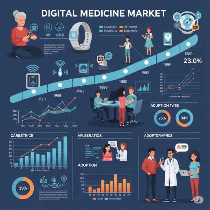 Digital medicine is the name given to the subsistence of digital technology, in particular apps for mobile health, gadgets to wear, online meeting with doctor, artificial intelligence (AI), digital therapy through measuring, monitoring and also undergoing the transformation of patient health. It uses functions, detectors, and data analytics to make diagnosis, give therapies and avoid sickness. The expansion of the digital medicine market is powered by the increasing healthcare expenses, the greater number of the population suffering from chronic diseases, the rise of personalized and distance care requests, the prevalent use of mobile phones and smart internet devices, and technological progress in fields such as AI, data analytics, and cloud computing. Further boosting this expansion are the beneficial government policies, the move toward the worth of healthcare, and the growth of public awareness of health protection.