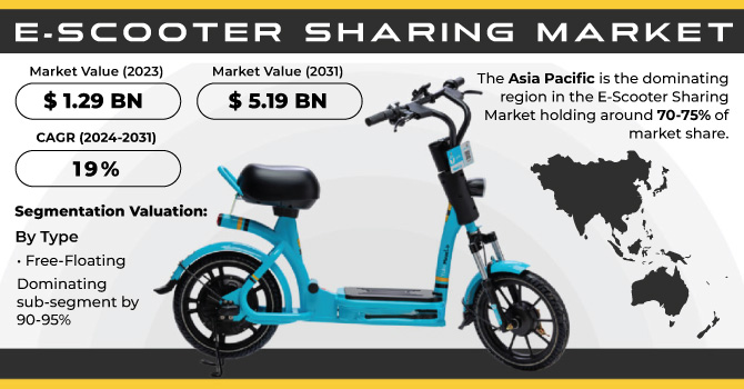 The Global E-Scooter Sharing Market is experiencing a rapid acceleration, driven by the increasing demand for sustainable and convenient urban mobility solutions, as well as the growing emphasis on reducing carbon emissions and traffic congestion in cities worldwide. According to a comprehensive market research report, the E-Scooter Sharing Market, valued at $1.29 billion in 2023, is poised for remarkable growth, projected to reach a staggering $5.19 billion by 2031. This impressive expansion is expected to occur at a robust compound annual growth rate (CAGR) of 19% during the forecast period of 2024-2031.