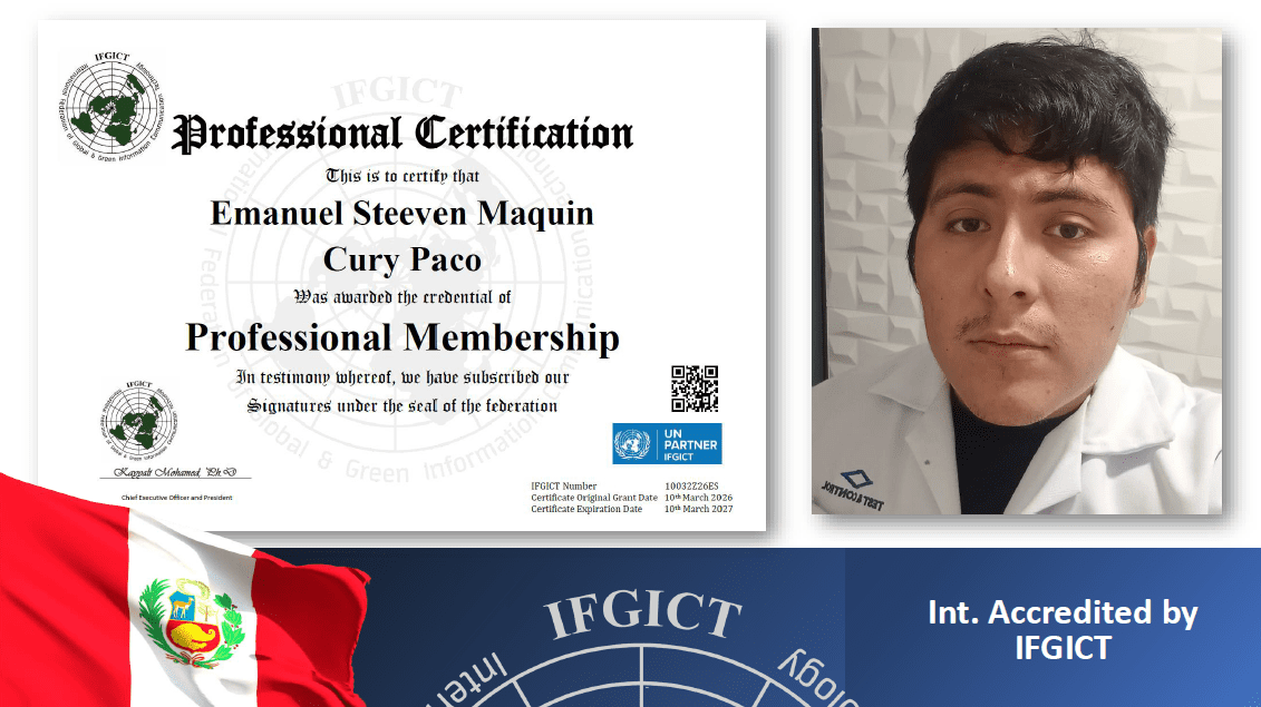 As the global industrial landscape shifts toward smarter, more autonomous operations, the role of international standards becomes vital. The IFGICT is a world-renowned organization that advocates for the integration of information and communication technology with environmental sustainability. By granting Emmanuel Steeven Maquin Cury Paco this professional membership, the federation acknowledges his commitment to these global standards. This credential distinguishes him as a specialist capable of navigating the technical complexities of modern industry while upholding the principles of Green ICT, ensuring that the technological advancements of tomorrow are both efficient and ecologically responsible.