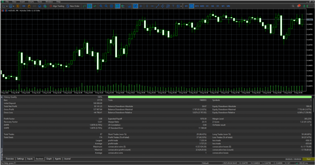 - Session-specific trading: Executes trades exclusively during the Australian and Asian market sessions, leveraging consistent volatility patterns for optimal trade setups;