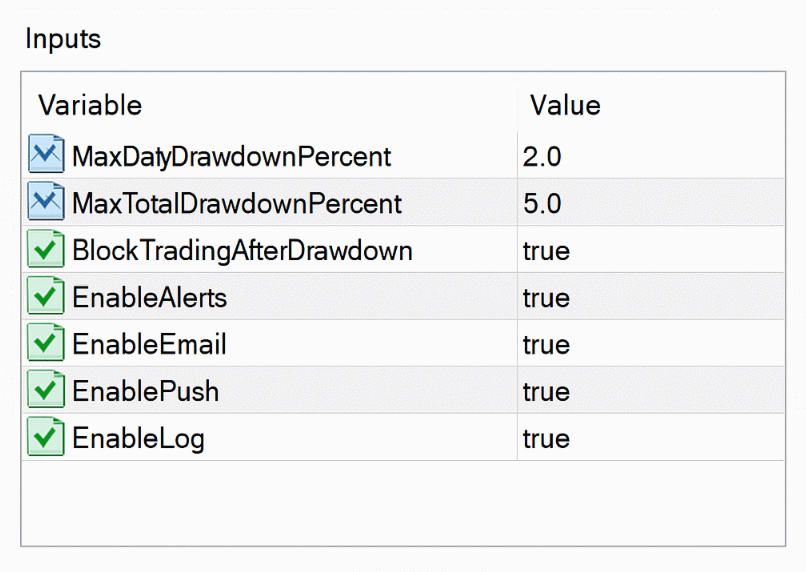 - Position closure on breach: Immediately closes all open trades when any drawdown limit is hit, preventing further losses;