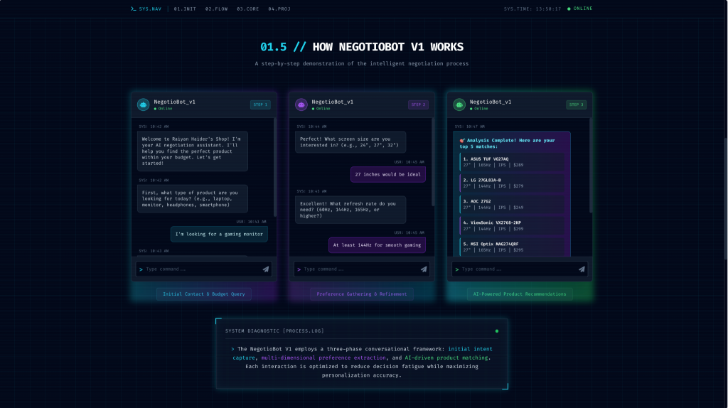 A key highlight of NegotioBot is its ability to perform budget optimization and smart filtering, ensuring that users receive recommendations aligned not only with their preferences but also with their financial limits. The platform can analyze multiple product attributes—including price, features, and relevance—to suggest the best possible options in real time.