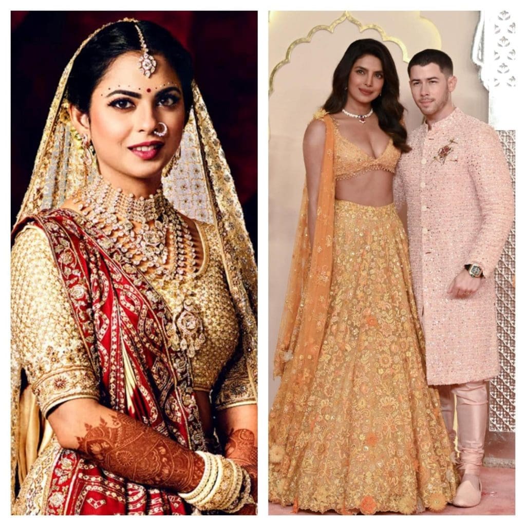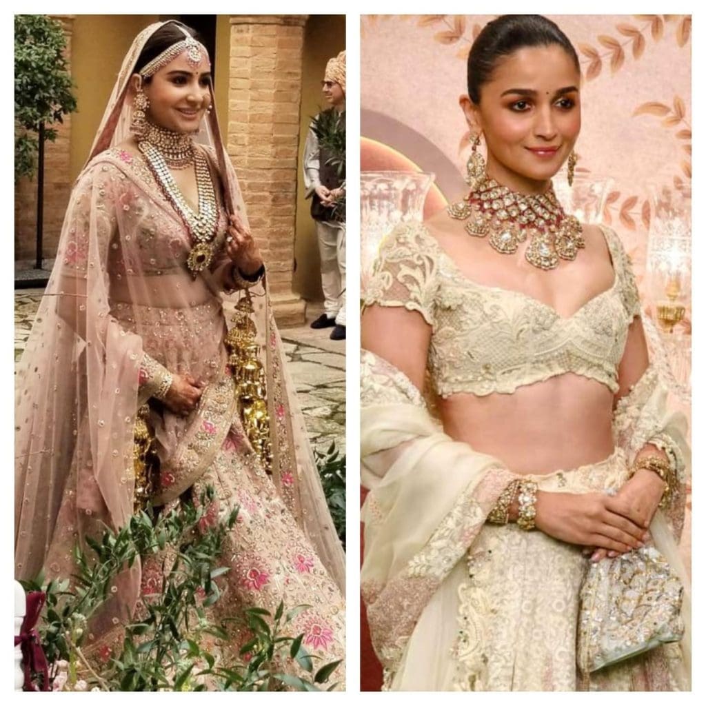 Let’s not forget Kiara Advani’s wedding look – a champagne gold lehenga with Mughal motifs paired with uncut diamonds. These looks are perfect for palace venues or night-time pheras under starry skies.