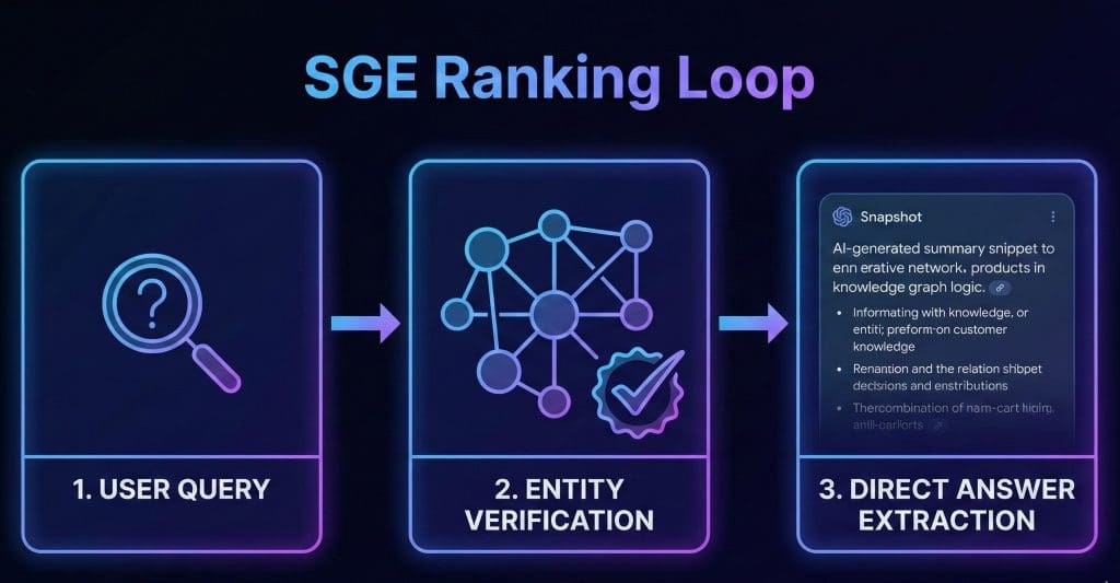 Google SGE generates AI-powered answers by retrieving trusted sources, validating entities, and synthesizing responses with citations.
