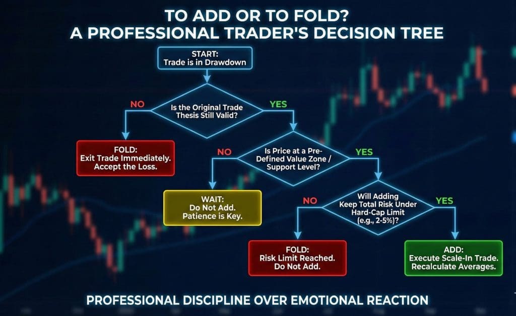 Professional scaling is proactive; retail averaging is reactive. Pros decide where they will add to a trade before they open the first lot. If the price action doesn’t hit those specific value zones, they don’t add.