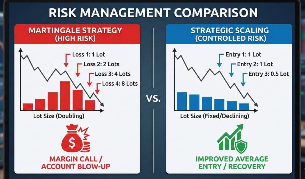 Averaging down is a strategic scale-in based on technical value zones and fixed risk limits. Martingale is a high-risk system that doubles position sizes after losses. Professionals use fixed risk, while Martingale uses infinite risk.