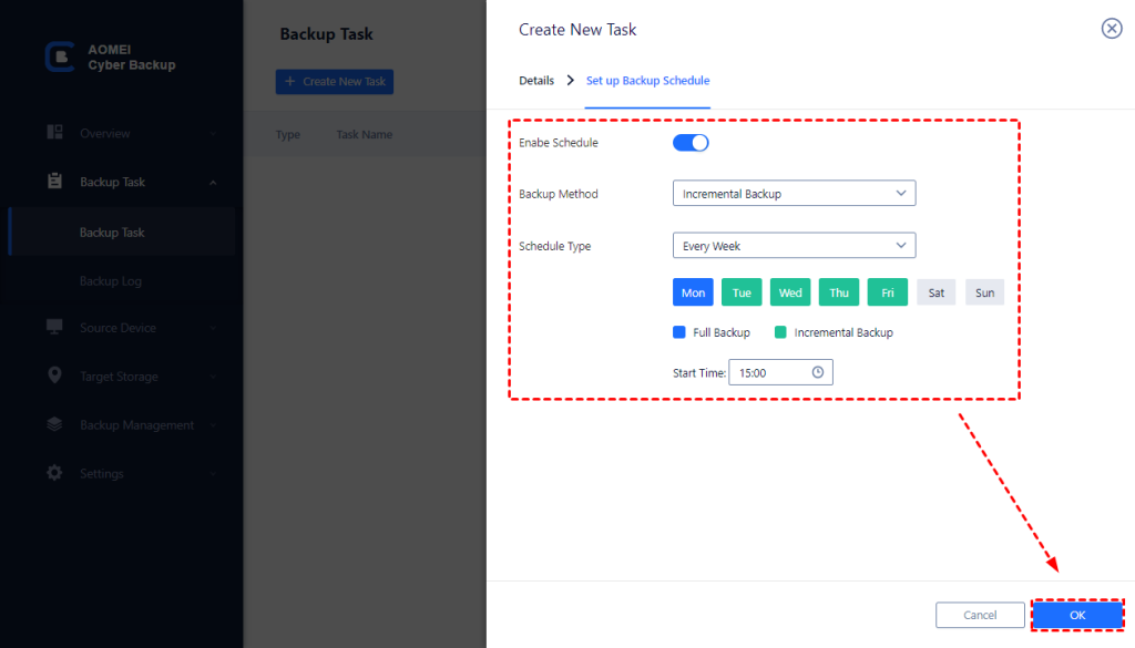 2. Create Backup Task: Navigate to Backup Task > + Create New Task, and then set Task Name, Backup Type, Device, Target, and Schedule.