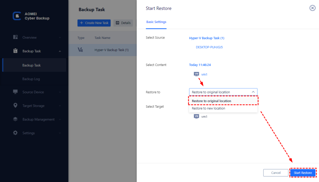 4. Restore VM: Click … > Restore on the backup task to open a wizard, and click Select Content to specify a restore point. Select to Restore to original location, and click Start Restore.