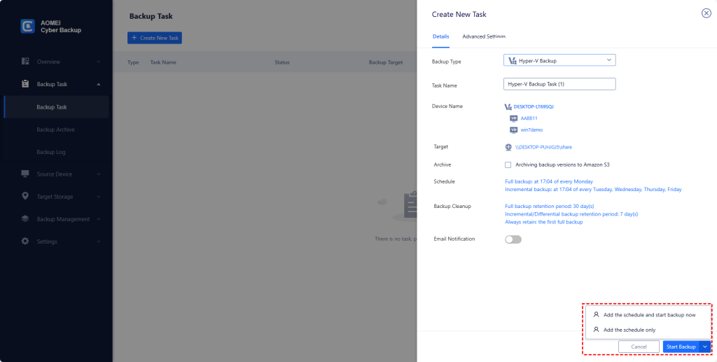 3. Run Backup: Click Start Backup and select Add the schedule and start backup now, or Add the schedule only.