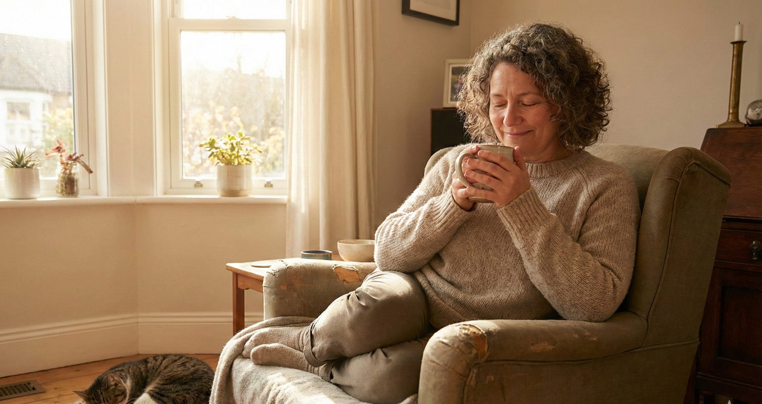 - Visual: A high-quality, warm-toned photo of a person sitting comfortably (perhaps on a sofa with a cup of tea), eyes closed, looking peaceful rather than rigid.