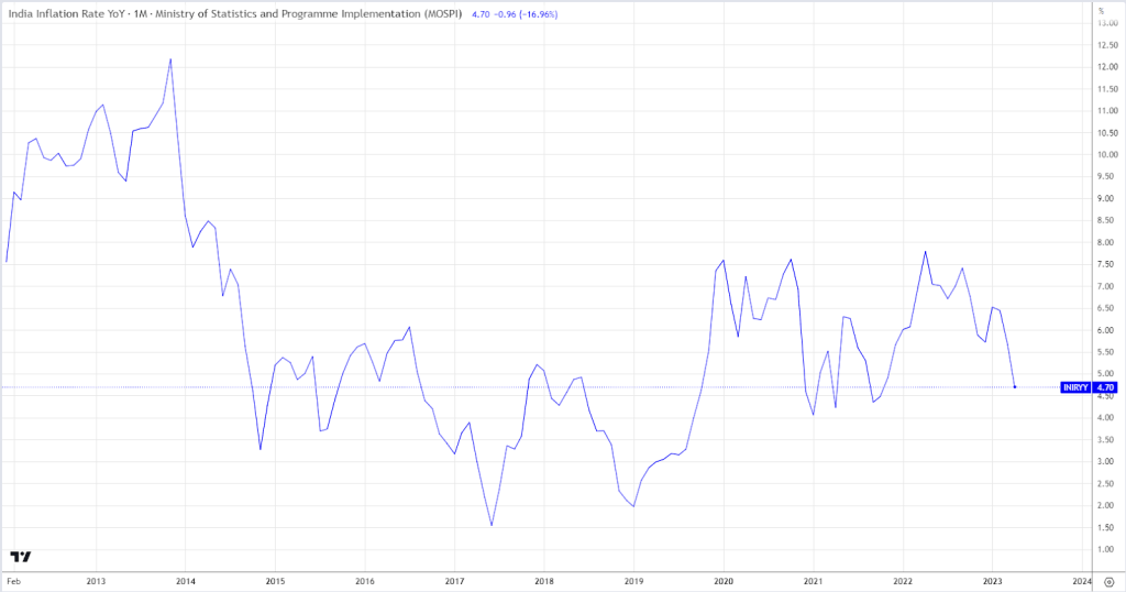 Inflation in India has been on a declining trend according to the latest economic calendar data. In April 2023, it dropped to 4.7% compared to 5.66% in March and 6.44% in February.