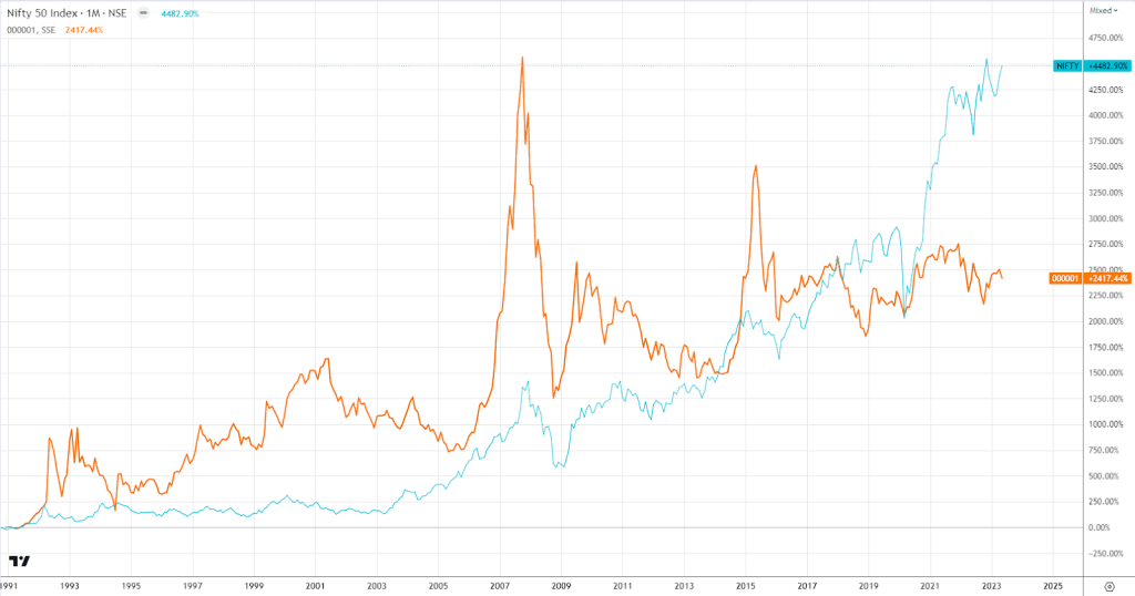 By comparing the main indices of India (NSE:NIFTY) and China (SSE:000001), it becomes evident that while the latter faces challenges, the former is experiencing active growth.