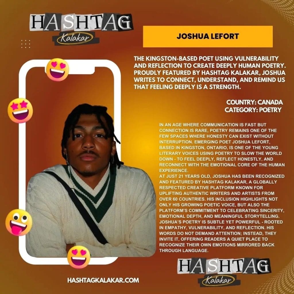 Joshua Lefort’s feature through Hashtag Kalakar places him among a global community of poets, writers, and artists celebrated for originality, emotional depth, and creative integrity. The platform is widely known for its transparency and commitment to showcasing real talent over trends.