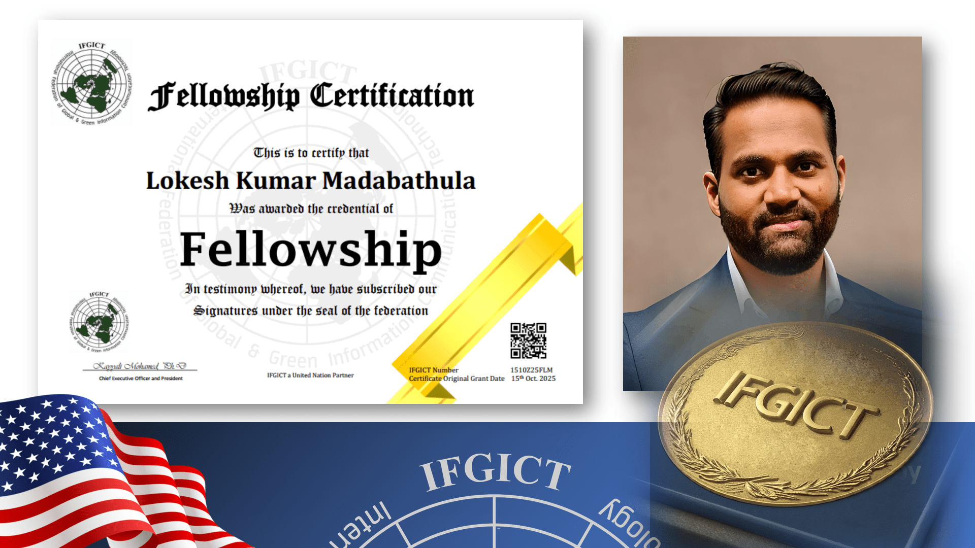 The IFGICT Fellowship is the highest distinction conferred by the International Federation of Global & Green ICT, an organization that champions the strategic use of ICT to promote sustainability, efficiency, and global development. Bestowing the Fellowship degree upon Lokesh kumar Madabathula is a definitive recognition of his role as a leader who innovates responsibly.