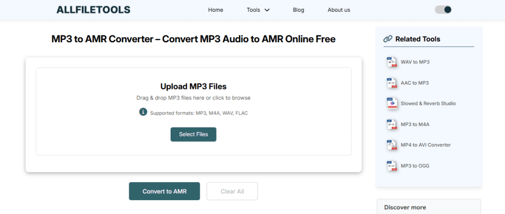 Step 1: Open your browser and go to a trusted site like AllFileTools.com. And use this tool MP3 to AMR Converter