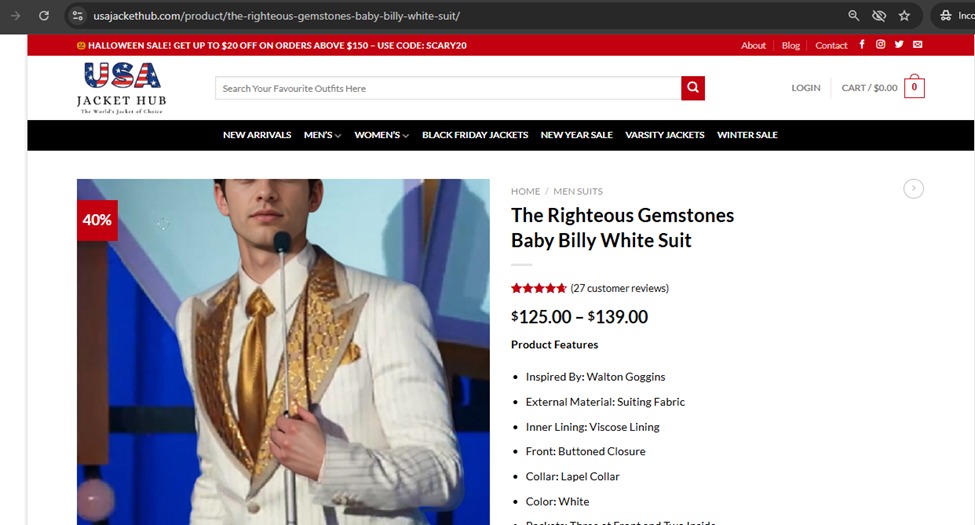 When I searched online for replicas, several websites popped up, but USA Jacket Hub immediately caught my eye. Their product page for The Righteous Gemstones Baby Billy Freeman Suit looked detailed, with high-quality photos, clear fabric information, and a realistic design that matched the one worn by Walton Goggins in the series.