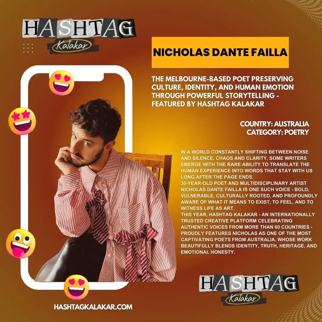 This year, Hashtag Kalakar – an internationally trusted creative platform celebrating authentic voices from more than 60 countries – proudly features Nicholas as one of the most captivating poets from Australia, whose work beautifully blends identity, truth, heritage, and emotional honesty.