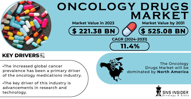The global oncology drugs market size is set to experience significant growth, with its market size estimated at USD 221.38 billion in 2023. According to industry forecasts, the market is expected to reach a staggering USD 525.08 billion by 2031, reflecting a compound annual growth rate (CAGR) of 11.4% over the forecast period from 2024 to 2031.
