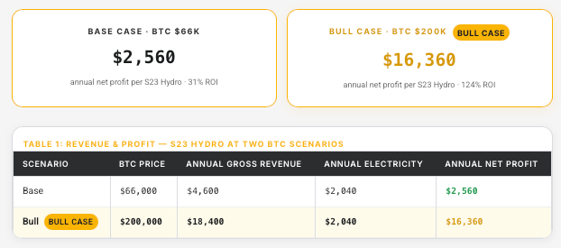 - Base Case (BTC $66,000): $4,600 gross annual revenue → $2,560 annual net profit per unit → 31% ROI