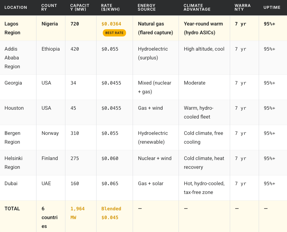 - Lagos Region, Nigeria — 720 MW at $0.0364/kWh (best rate): Natural gas (flared capture), year-round warm climate ideal for hydro ASICs