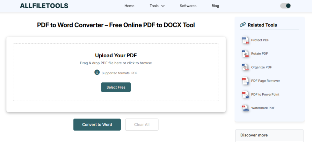 - Step 1: Open your web browser and go to a trusted website like AllFileTools.com. And use this Tool PDF to Word Converter