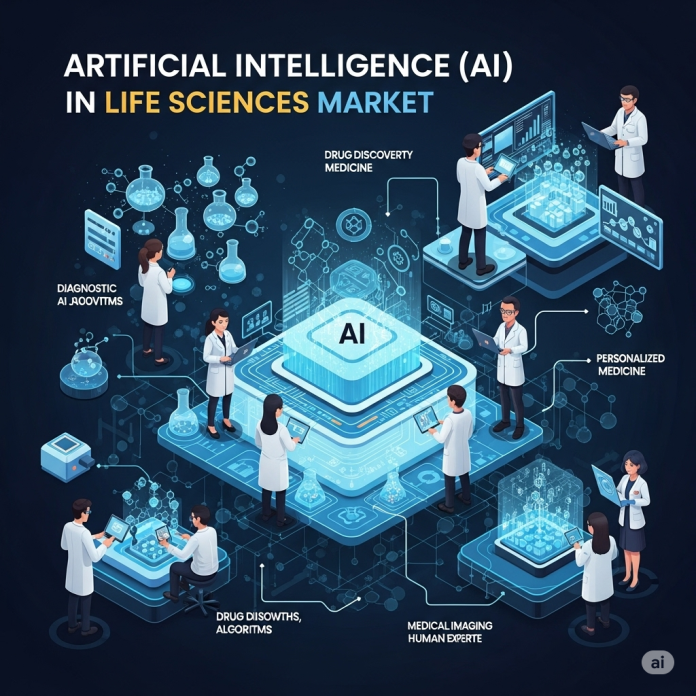 Artificial Intelligence (AI) in Life Sciences refers to the use of machine learning, data analytics and automation to increase research, drug discovery, diagnostics and personalized medicine. The market is growing rapidly due to increasing data volume in genomics and clinical research, increasing demand for rapid drug development and more accurate, cost-effective healthcare solutions. AI enables deep insight by complex biological data, accelerate clinical trials, and supports decision making in the patient’s care, drugs, biotechnology and its adoption in healthcare sectors.