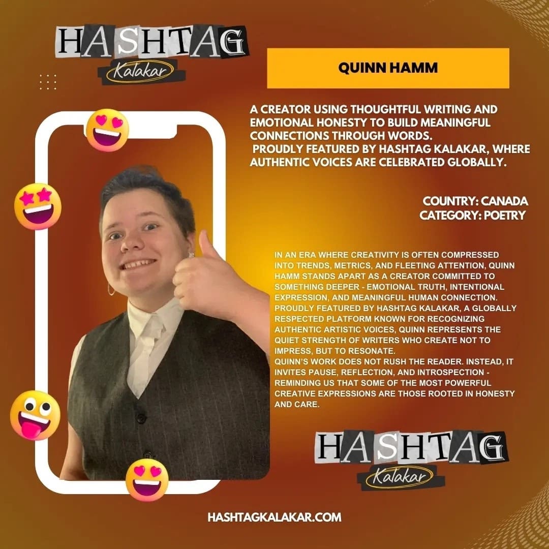 In an era where creativity is often compressed into trends, metrics, and fleeting attention, Quinn Hamm stands apart as a creator committed to something deeper – emotional truth, intentional expression, and meaningful human connection. Proudly featured by Hashtag Kalakar, a globally respected platform known for recognizing authentic artistic voices, Quinn represents the quiet strength of writers who create not to impress, but to resonate.