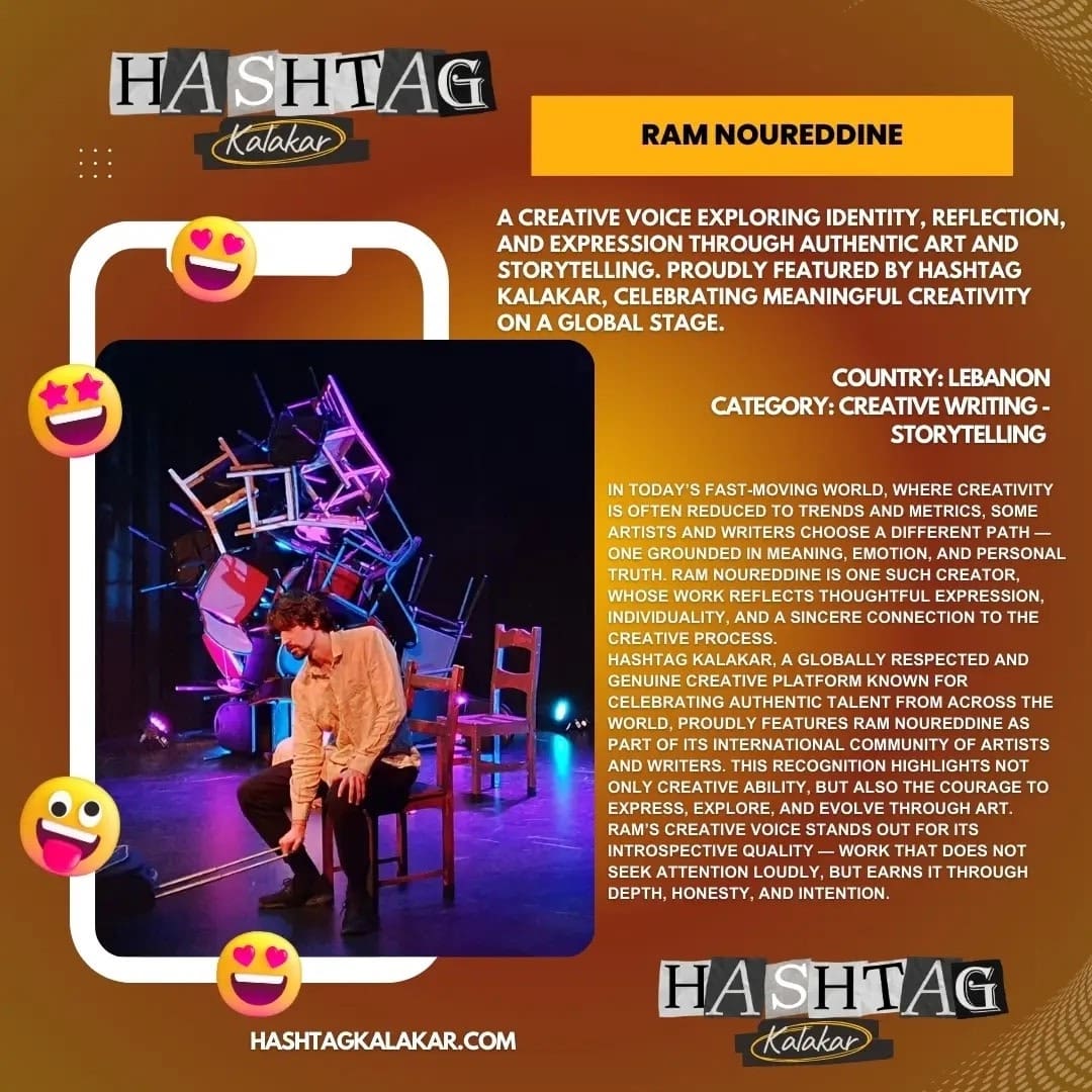 Hashtag Kalakar, a globally respected and genuine creative platform known for celebrating authentic talent from across the world, proudly features Ram Noureddine as part of its international community of artists and writers. This recognition highlights not only creative ability, but also the courage to express, explore, and evolve through art.