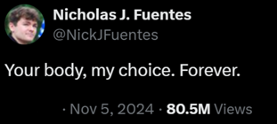 Nick Fuentes is attributed with the quote, “Your body, my choice. Forever,” with over 80 million views on X.