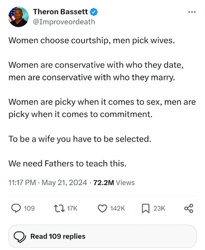 Theron Bassett is known for, “To be a wife, you have to be selected. We need fathers to teach this,” with over 70 million views on X.