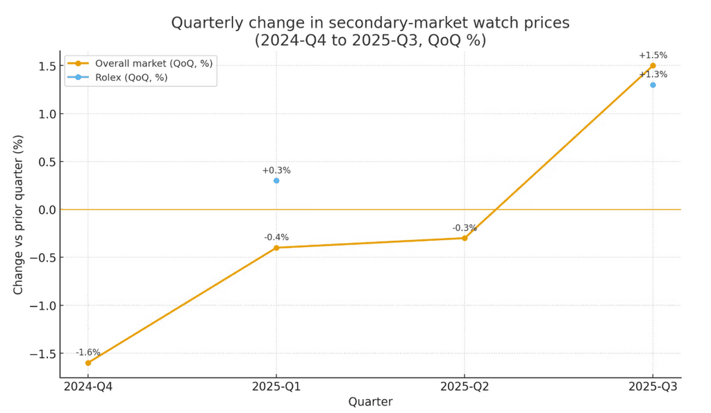 | Shallow declines, then firming | 2024–H1 2025 | Slower dips; Rolex inches up | Policy headlines; resilient core-model demand |