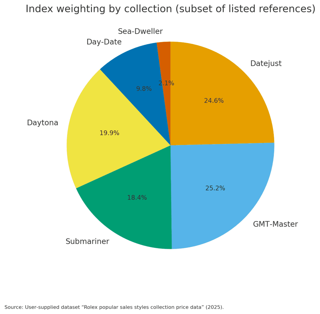 SOURCE: User-supplied dataset “Rolex popular sales styles collection price data” (2025)