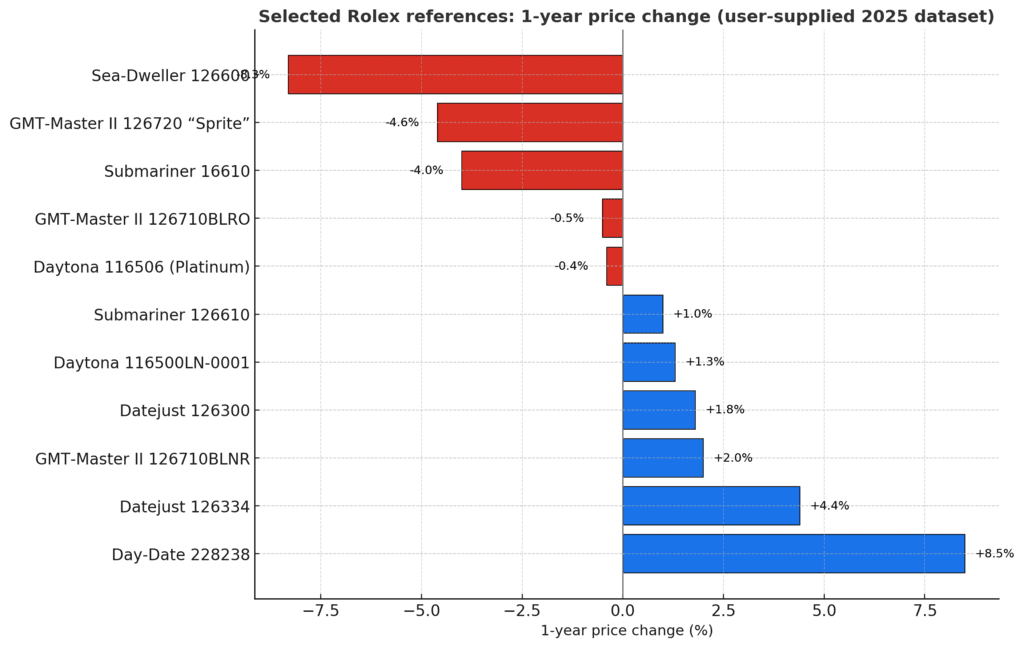 | More volatile | Oyster Perpetual bright dials, Yacht-Master II | Fashion-driven spikes, narrower buyer pool, sharper cycle moves |