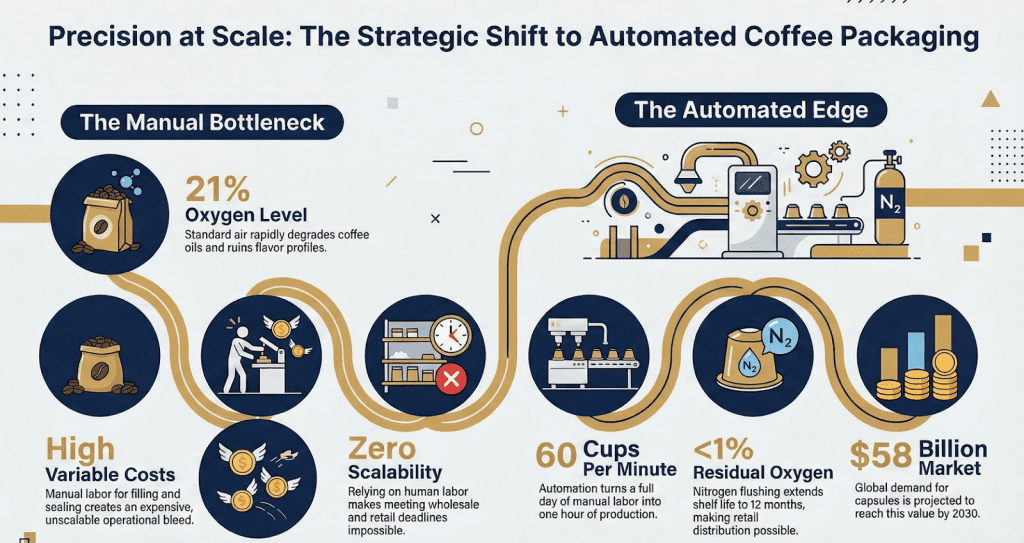 Scaling a coffee business requires a hard look at your supply chain capabilities. As demand for single-serve capsules surges, roasters are quickly realizing that manual filling allows for no scalability. It becomes impossible to meet wholesale deadlines relying solely on human labor.
