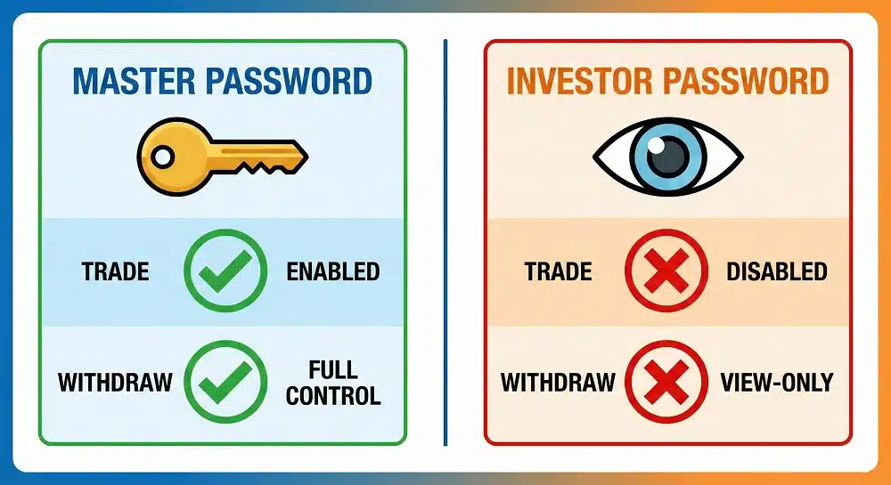 An investor password is a read-only login credential for your forex account. Unlike a master password, it prevents anyone from placing trades or changing settings. Traders use it to: