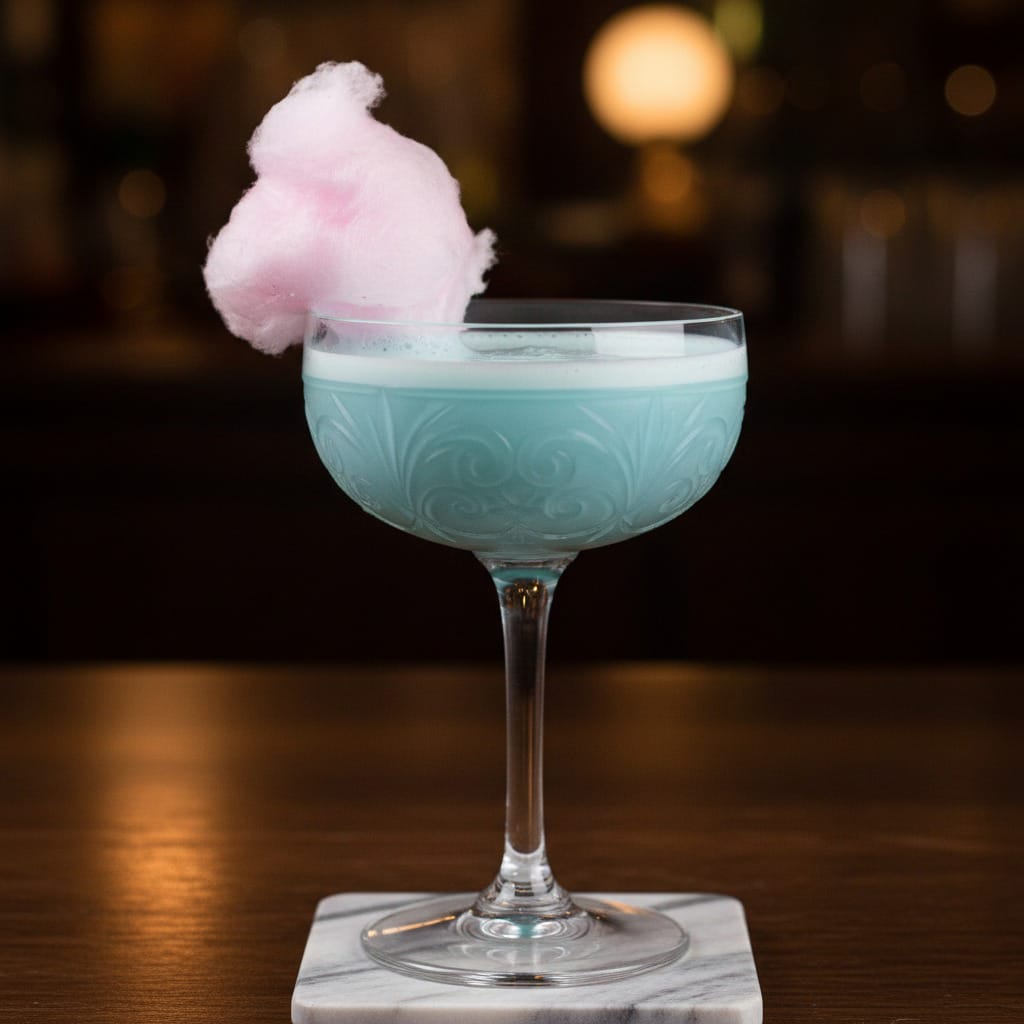 Presentation Tip: Serve immediately to preserve the cotton candy’s fluffy texture—it creates a playful contrast to the silky, vibrant blue cocktail beneath.