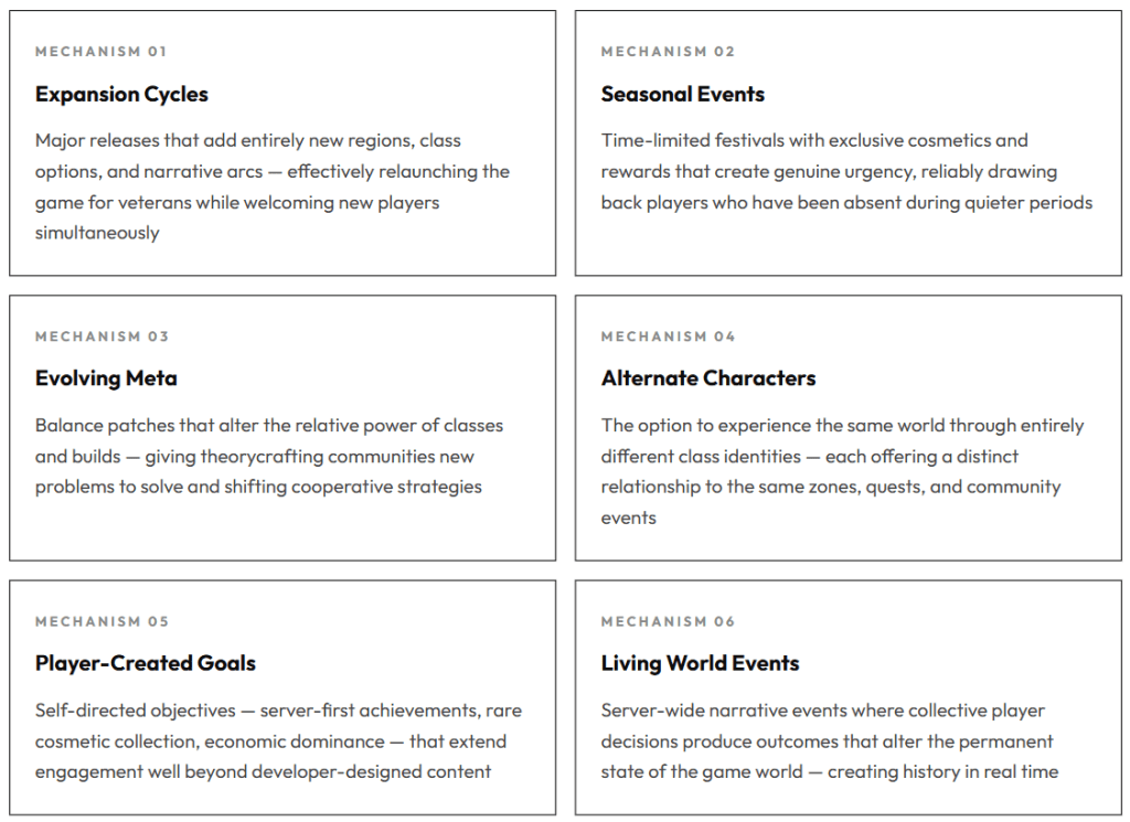 This is achieved through a combination of mechanisms that the genre has refined across decades. Some of them are visible, new content patches, seasonal events, and expansion launches. Others are structural, the way class balance updates shift the meta and force players to reconsider approaches they have taken for granted for months. All of them share the same underlying function: ensuring that the game a player logs into today is meaningfully different from the one they logged out of six months ago.