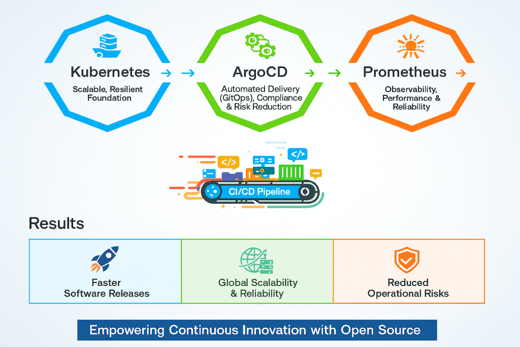 With the help of Prometheus, the system was made observable, thus performance and reliability were guaranteed; the Argo CD automated delivery, which is based on GitOps, ensures compliance and lessens the distribution risk.