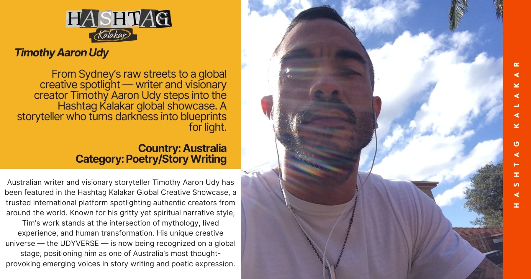 Sydney, Australia — Australian poet, storyteller, and multidisciplinary creator Timothy Aaron Udy has been honored as a featured writer in the prestigious Hashtag Kalakar Global Creative Showcase — a global platform renowned for uplifting authentic talent and giving creators a credible stage to shine. With participants spanning over 60 countries, Hashtag Kalakar has become a symbol of artistic integrity, and Timothy’s recognition marks a significant milestone in his creative journey.